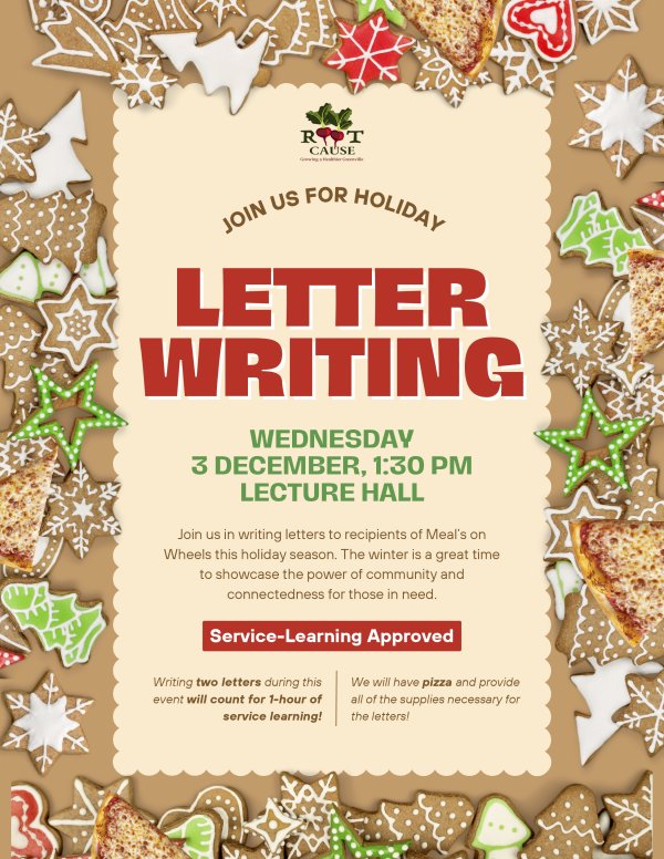 Root Cause is writing letters to Meals on Wheels recipients as our December service project. This is a great way to showcase the power of companionship and community during the holiday season - and to earn a service learning hour. We’ll have pizza and all of the supplies you need!